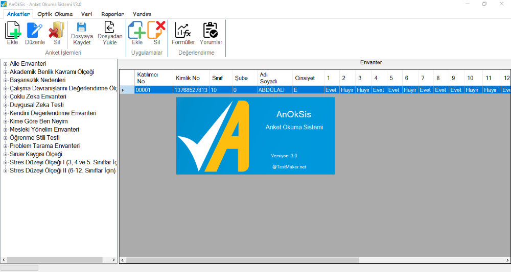 AnOkSis Anket Okuma Sistemi her türlü optik formun tarayıcı yardımıyla okunması ve verilerin metin ya da excel dosyası şeklinde kaydedilmesi işlemini gerçekleştirir.
